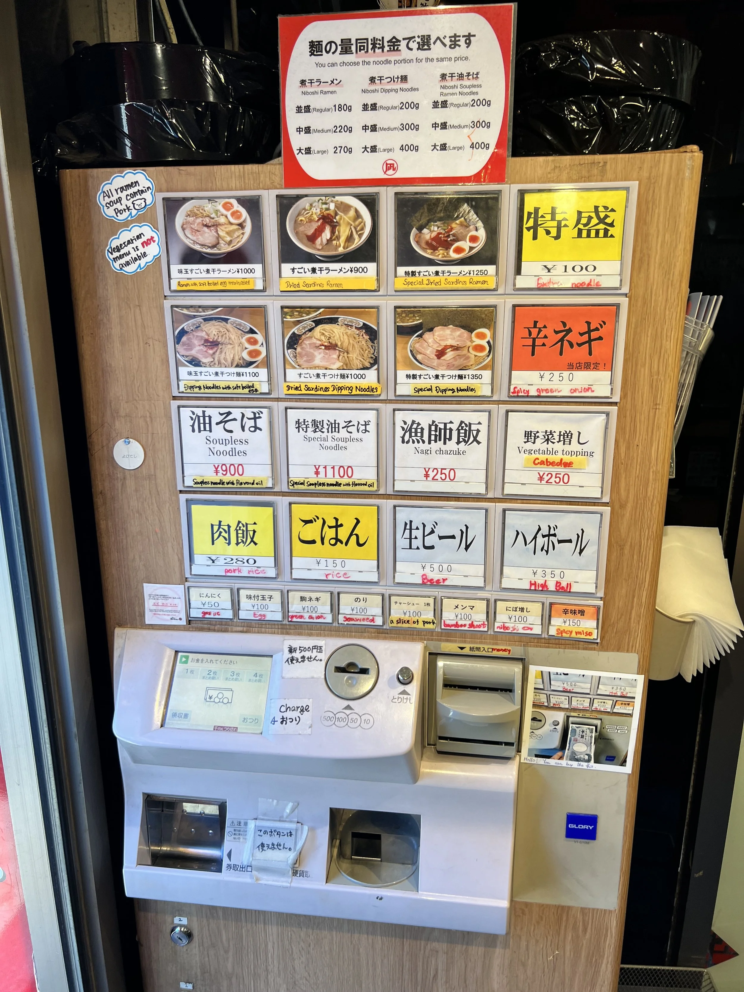 Ramen shops in Tokyo typically follow the traditional Shokkenki (meal ticket machine) ordering system. Usually at the front of the shop, look for a vending machine style device with (sometimes) pictures and (mostly in Japanese) descriptions of your options. Money goes in first, then pick your ramen style, and finally your toppings and extras. You’ll likely be confused, and like me, immediately out yourself as a tourist. If you feel panicked, just hit the large button in the top left corner. It’s almost always the shop’s specialty dish.